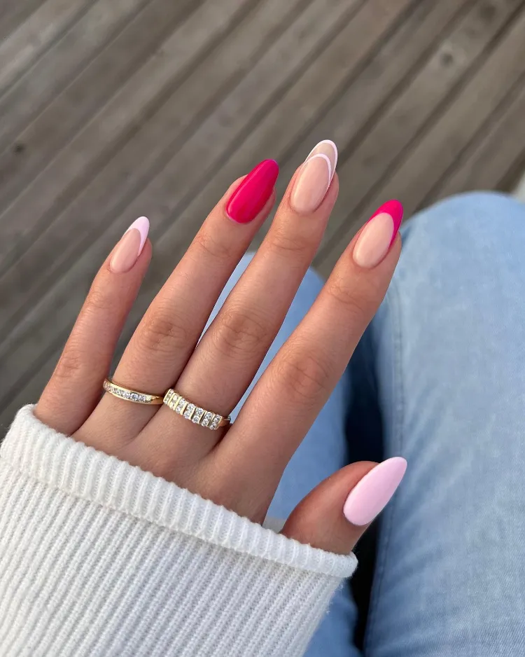 Bold yet balanced, this design pairs striking hot pink with neutral tones for a chic contrast. The single lined accent nail adds a playful detail without overpowering the look. It’s the kind of manicure that feels just right for date night or brunch with the girls.