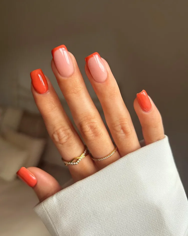 If you’re craving a little spice in your manicure, these fiery orange tips are the way to go. Paired with a natural nude base, the color really pops without feeling too loud. It’s a confident, uplifting choice that brings warmth to any outfit.