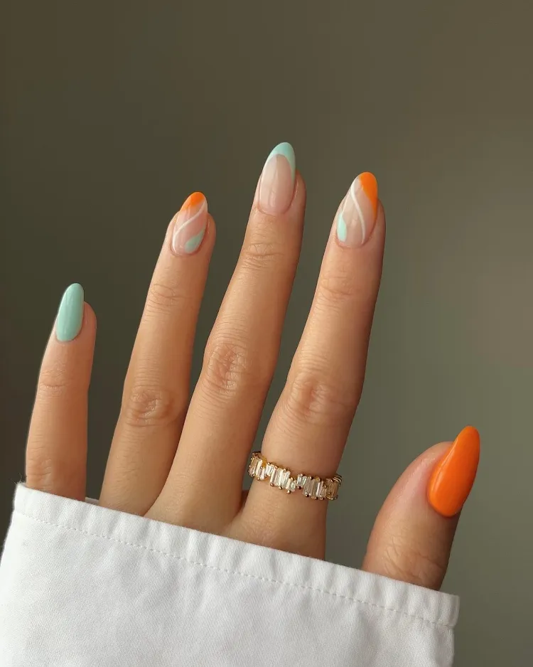 This set plays with bold contrast—cool aqua paired with juicy orange swirls on a nude base. The artistic blend of colors feels like a summer sunset on your nails. Perfect if you want something creative, bright, and Instagram-worthy all at once.