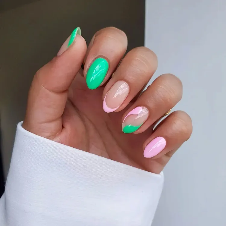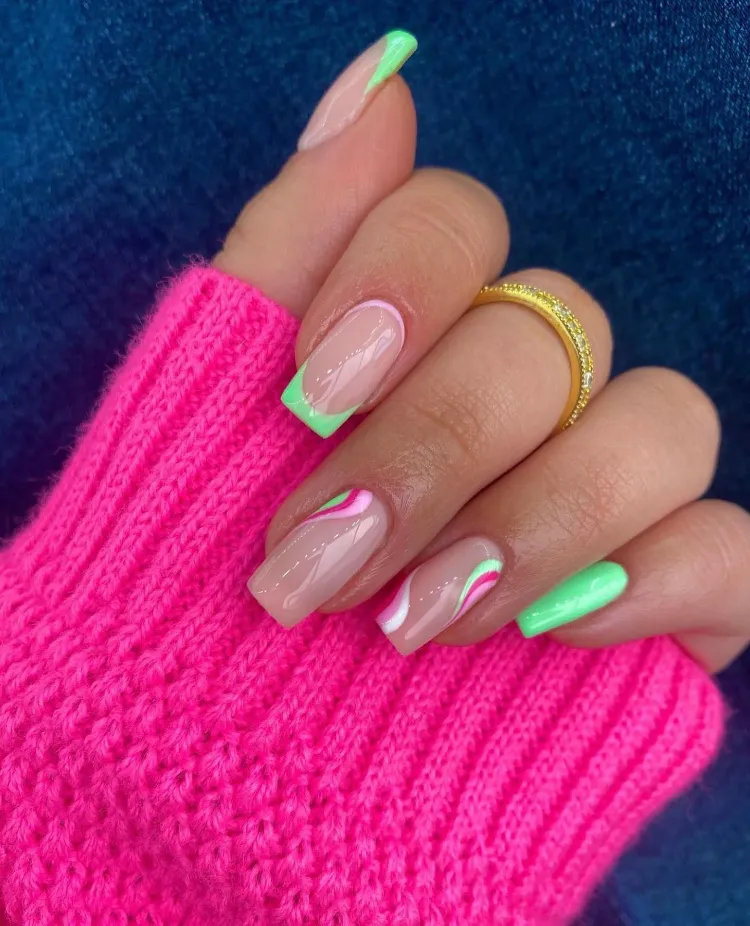 If you’re in the mood for nails that instantly brighten your day, this design is for you. Neon green and hot pink swirls bring a playful edge, balanced with nude spaces to keep it chic. It’s fun, flirty, and made for standing out in style.