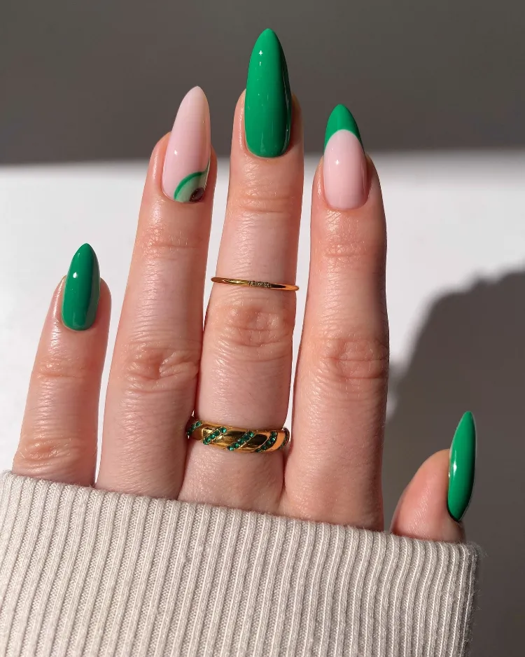 Bold emerald green meets chic nude with playful swirl accents that add just the right amount of personality. This mani feels both classy and daring, making it perfect for turning heads without going over the top. A fresh twist on green nails you’ll want to wear all season.