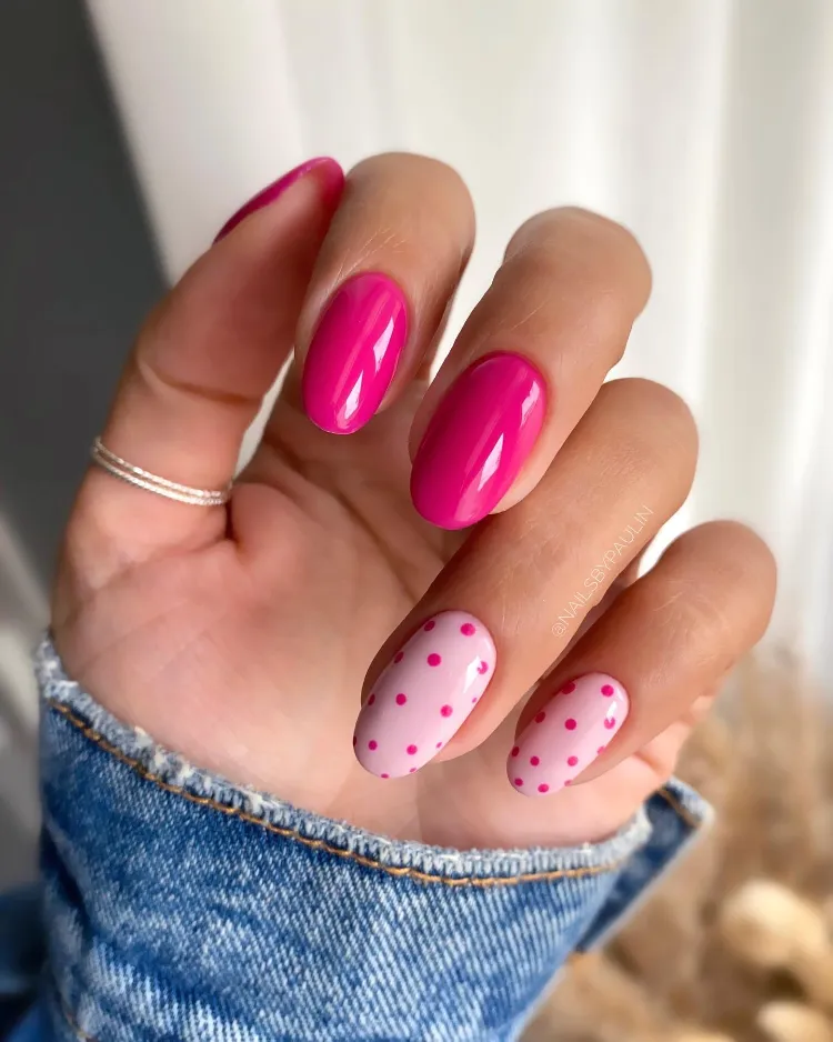 Fun, flirty, and full of personality—these hot pink nails paired with soft pink polka dots bring a playful vibe you’ll never get tired of. Perfect for spring outings, summer brunch dates, or whenever you need a pop of joy at your fingertips.
