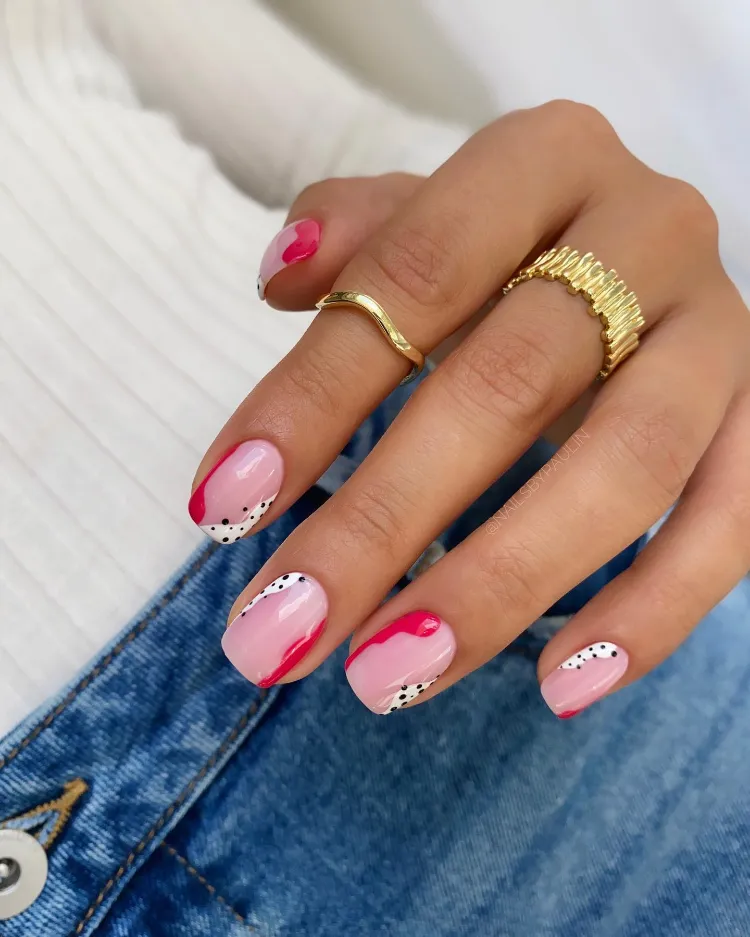If you love creative nail art, these abstract waves in red, pink, and black dots are pure perfection. The flowing patterns feel artsy and unique, making every nail look like a mini canvas. A statement mani for anyone who’s all about standing out stylishly.