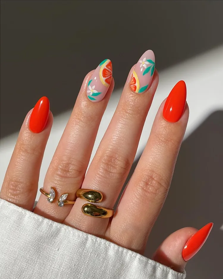 Nothing says “fresh and fun” quite like citrus nail art. With zesty orange slices and floral accents paired with bold orange polish, this manicure feels like summer bottled up. Vibrant and cheerful, it’s the perfect pick-me-up for your nails when you want to brighten your mood.
