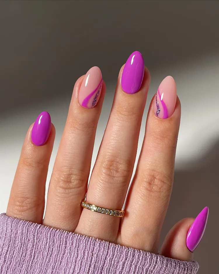 This vibrant purple mani is a total showstopper. With glossy purple polish paired with delicate swirl accents on nude, it strikes the perfect balance between bold and stylish. If you’re craving nails that feel modern and powerful, these are exactly what you’ve been waiting for.