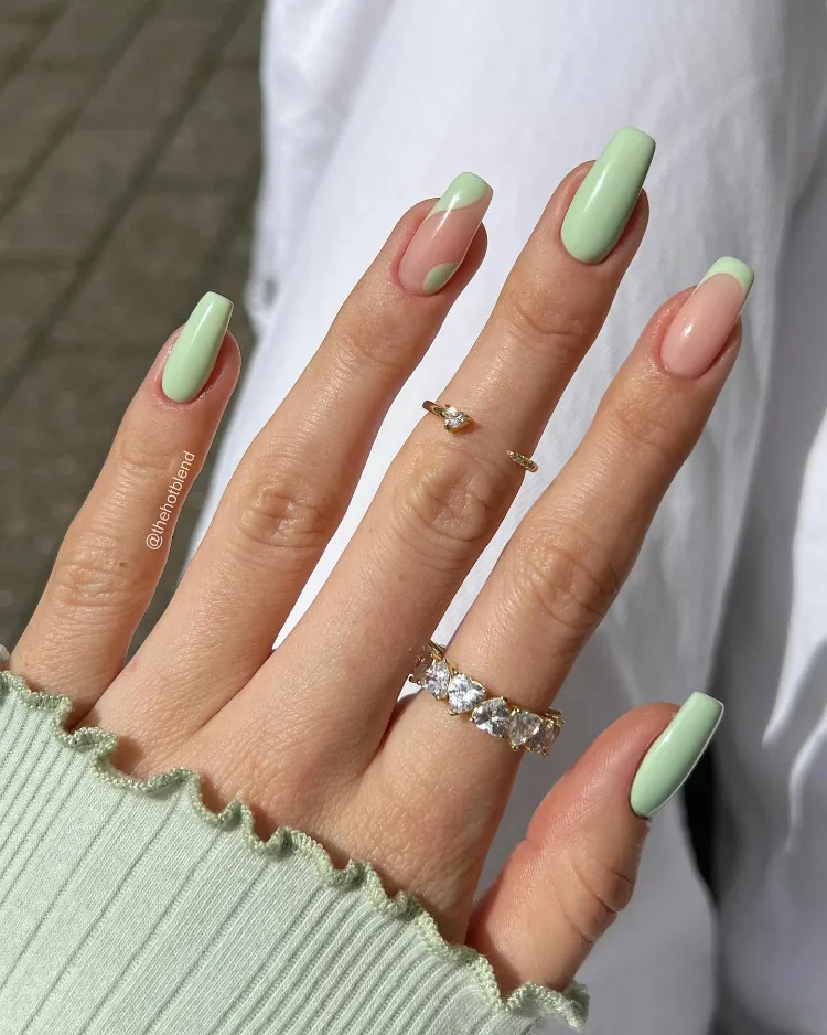 These nails prove that green can be elegant and soft, not just bold. The pastel mint French tips look fresh against the nude base, giving a clean yet trendy aesthetic. It’s an easy pick for spring lovers who still want a polished, everyday manicure.