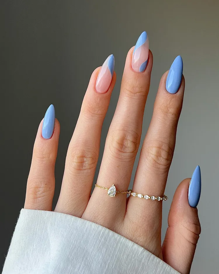 Cool and elegant, these sky-blue nails with nude wave details are perfect for anyone who loves serene shades with a hint of artistry. The soft blue feels calming while the design keeps it interesting. Wear them to channel a breezy, polished vibe all week long.