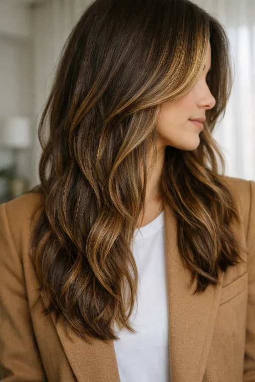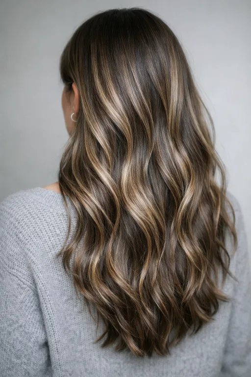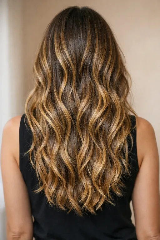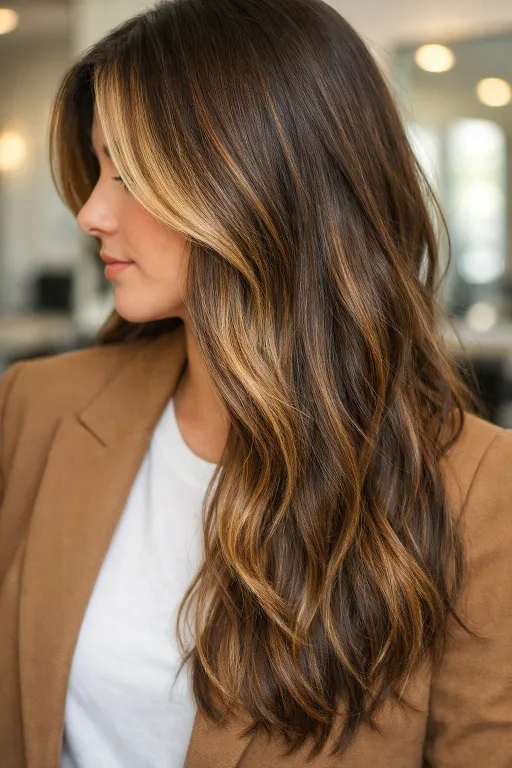 This long brunette has soft honey balayage that starts mid-length and fades into warm ends. The contrast is gentle, so it still reads natural in daylight. Worn with loose texture, it looks like a summer glow that grows out nicely.