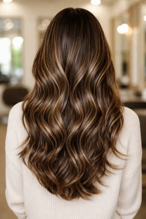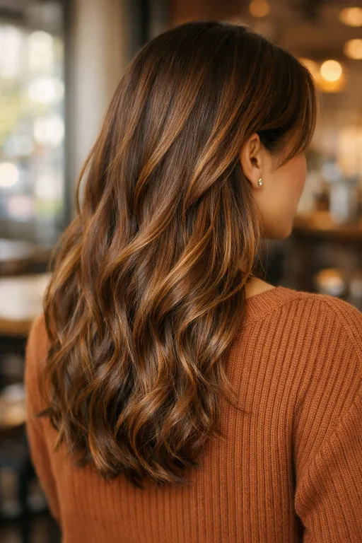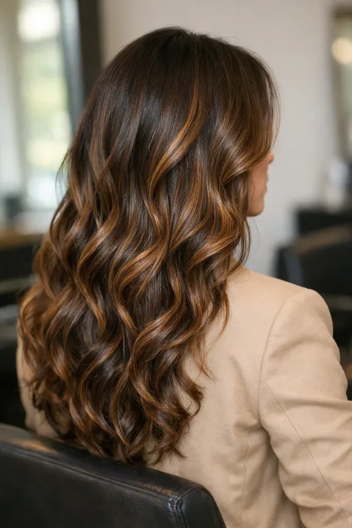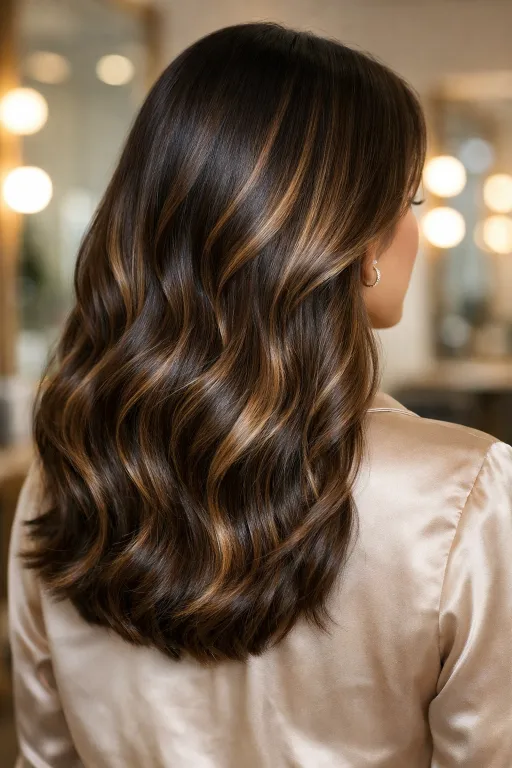 A glossy chocolate base with fine caramel streaks is perfect when you want shine more than drama. The highlights are subtle, but they catch the light along the waves and make the color look deeper. It’s an easy win for everyday wear.