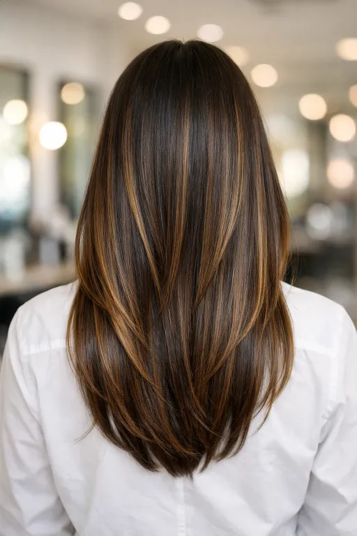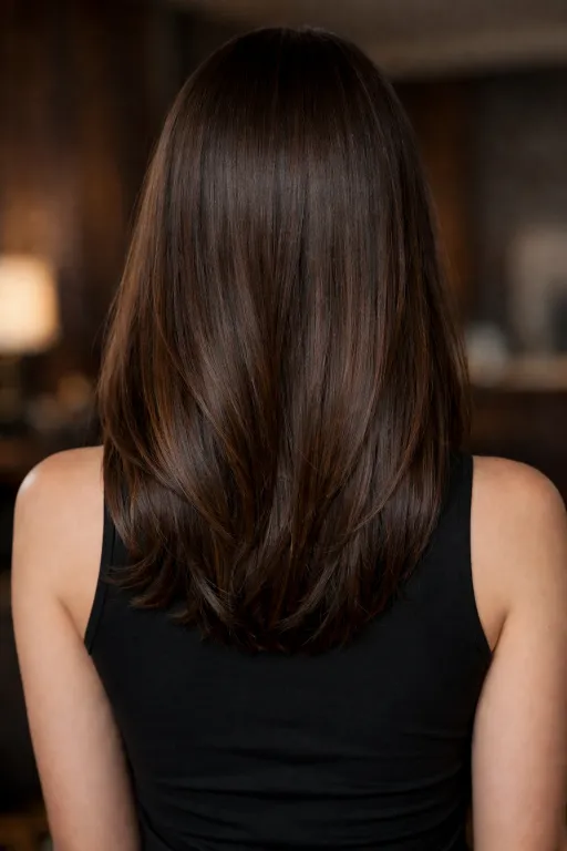 If you’re into barely-there color, this ultra-subtle balayage is it. The brunette base looks inky and healthy, with just a whisper of warm dimension near the ends. It reads polished up close and natural from a distance.