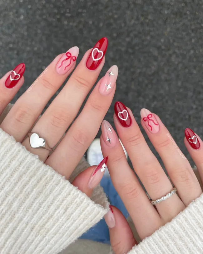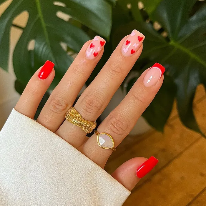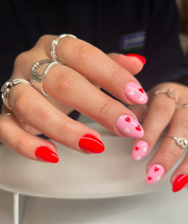 Red and pink tips alternate across the hand, each crowned with a petite heart. It’s simple, flirty, and incredibly photo-ready. The almond shape keeps it elegant, while the color pairing screams Valentine energy. Wear it with a red knit or pink gloss for a romantic, coordinated moment.