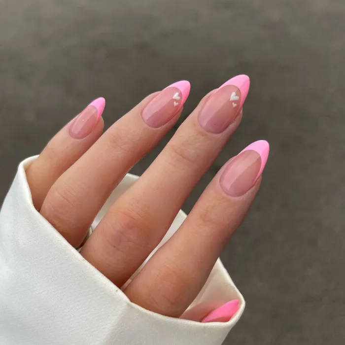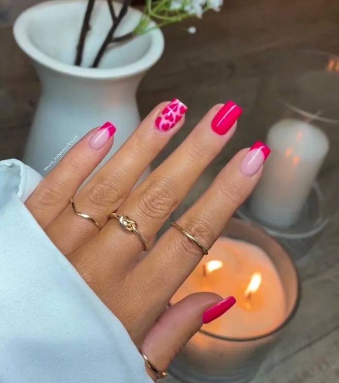 A modern French in vivid pink brings instant energy, while a single accent nail layered with tiny hearts keeps things romantic. The squared shape feels clean and current, making this look super wearable beyond February. Think: low-effort, high-impact nails that photograph beautifully and elevate every selfie. Effortlessly flirty.