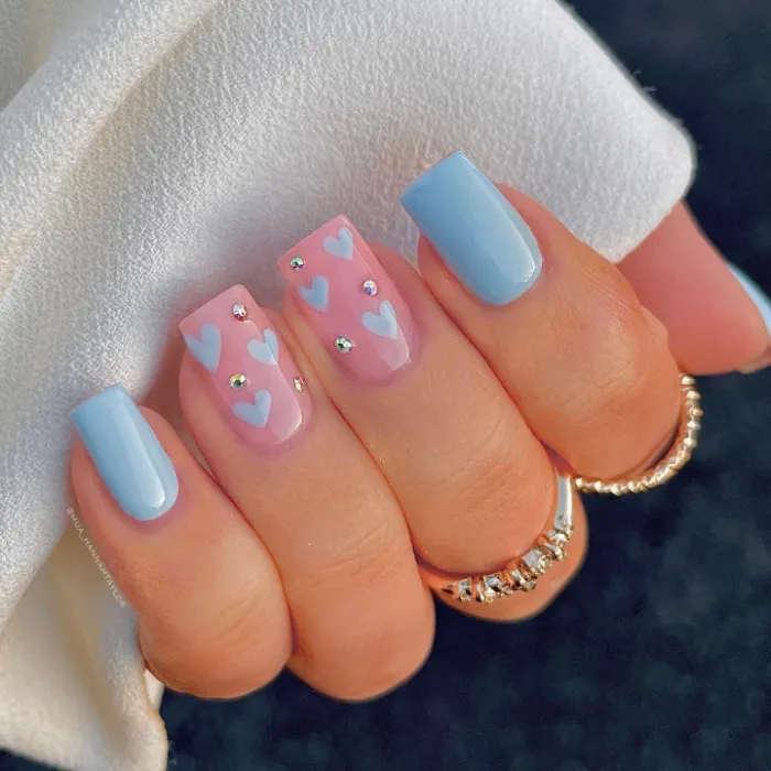 Love a softer palette? This pastel blue and baby pink combo sprinkles in white hearts and tiny crystals for that dreamy, rom-com sparkle. The square shape keeps it modern, while the glossy finish feels lux. It’s sweet without being saccharine—perfect for brunch dates and cozy movie marathons.