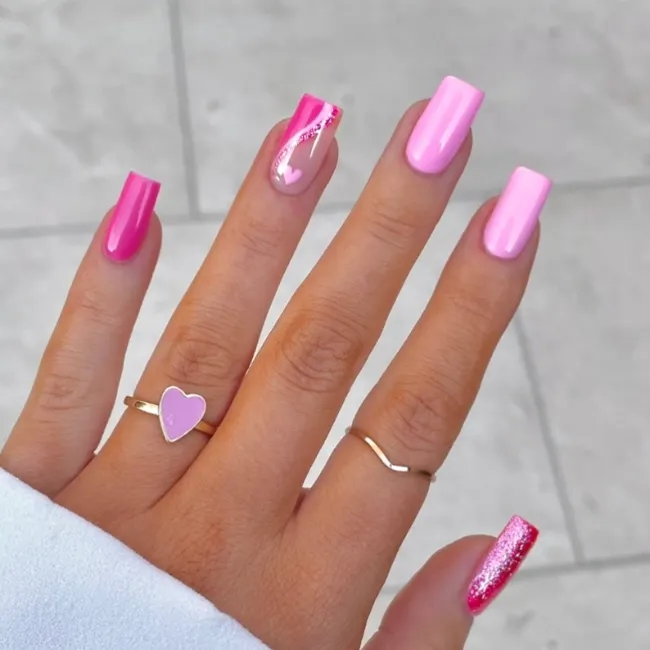 A high-shine pink is already a mood, but that subtle heart cutout detail is the real show-stealer. Add a dash of glitter on one nail for a little “main character” sparkle. It’s effortless, romantic, and instantly brightens every outfit—from casual tees to date-night satin.