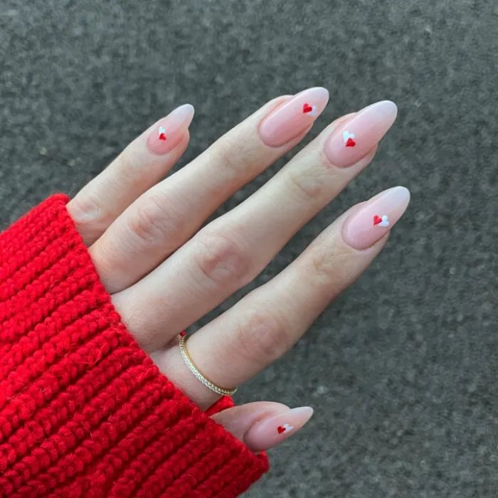 A soft pink base dotted with tiny hearts proves you don’t need intricate art to feel festive. Short, rounded tips keep it practical and chic, while the glossy finish makes it look salon-fresh. This is the prettiest everyday Valentine mani—sweet, simple, and totally wearable with anything in your closet.