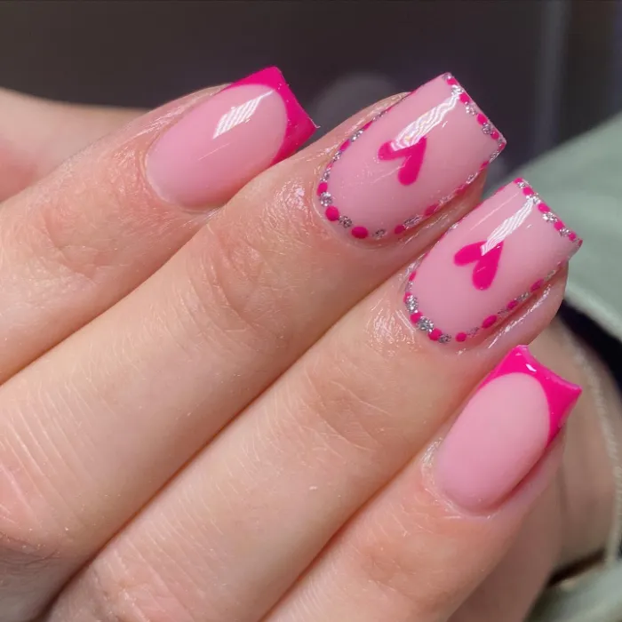 Vivid pink tips meet the cutest heart-drop accents for a look that’s playful but polished. Dotted borders add sparkle and shape, giving each nail its own moment without losing the cohesive vibe. It’s flirty, lively, and perfect for anyone who wants their Valentine mani to actually make a statement.