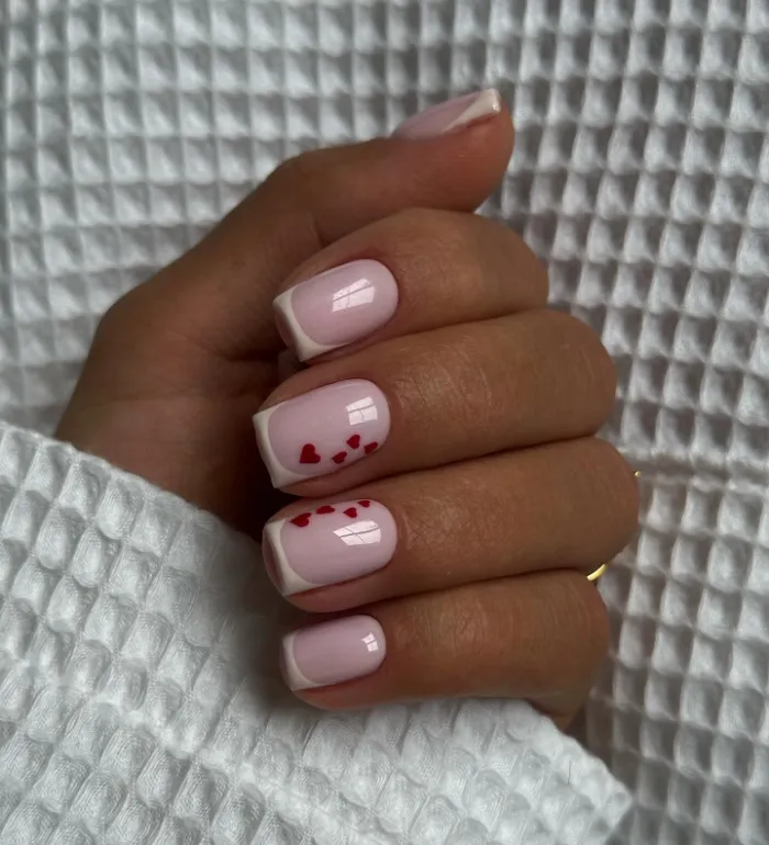 Clean white French tips on a milky base get a sweet surprise—tiny red hearts clustered near the cuticle. It’s classic with a twist, the kind of detail you notice twice. Pair with a cozy robe or sleek blazer; either way the nails look chic, glossy, and totally February-coded.