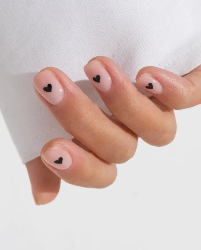 For the girlies who love neutrals, try tiny black hearts on a sheer, milky base. It’s modern, a touch edgy, and still totally romantic. The negative space keeps it breathable and effortless, while the micro art reads cool rather than cutesy. Wear with silver jewelry and a crisp white sleeve—chef’s kiss.