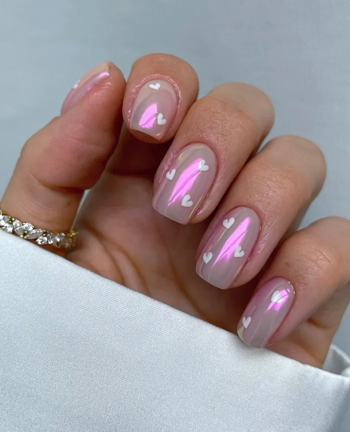 That glowy, pearl-pink chrome catches the light beautifully, and the teeny white hearts sprinkled across each nail make it undeniably Valentine. It’s romantic but polished, perfect if you love a high-shine, glassy finish. Expect compliments—this one radiates from every angle and photographs like a dream.